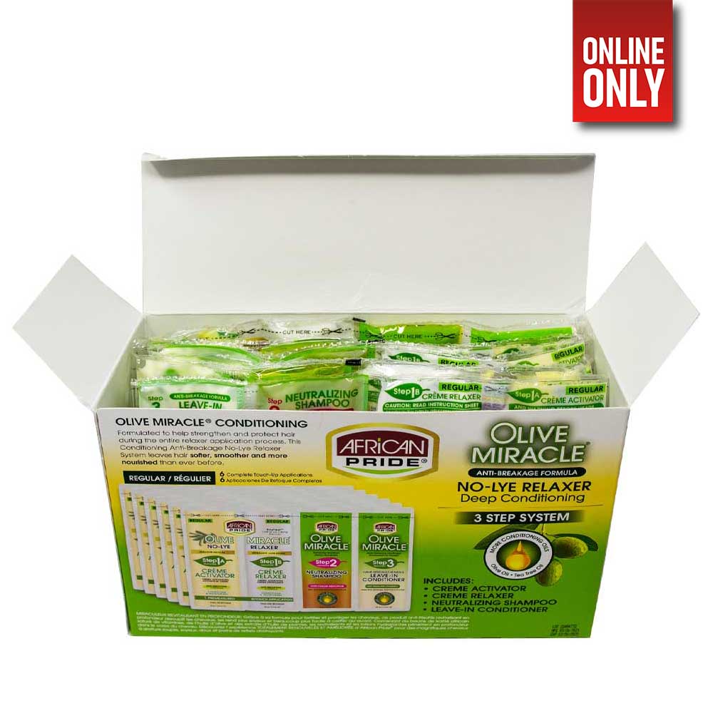 African Pride Olive Miracle Creme on Creme No Lye Relaxer Touch Up Kit is one complete touch up kit. All new African Pride Olive Miracle Creme on Creme No Lye Relaxer Touch Up Kit formula is enriched with Extra Virgin Olive Oil and Sbhgea Butter for the ultimate in silky smooth straight hair from edges to ends. our unique StayFresh Creme-on-Creme formula makes touch ups quick, easy and mistake free. Say goodbye to the mixing errors and mess of liquid activators. And thanks to our StayFresh System, it stays fresh longer. Enjoy perfect straightening results every time with more conditioning and moisturizing in just 3 easy steps
