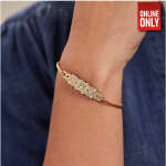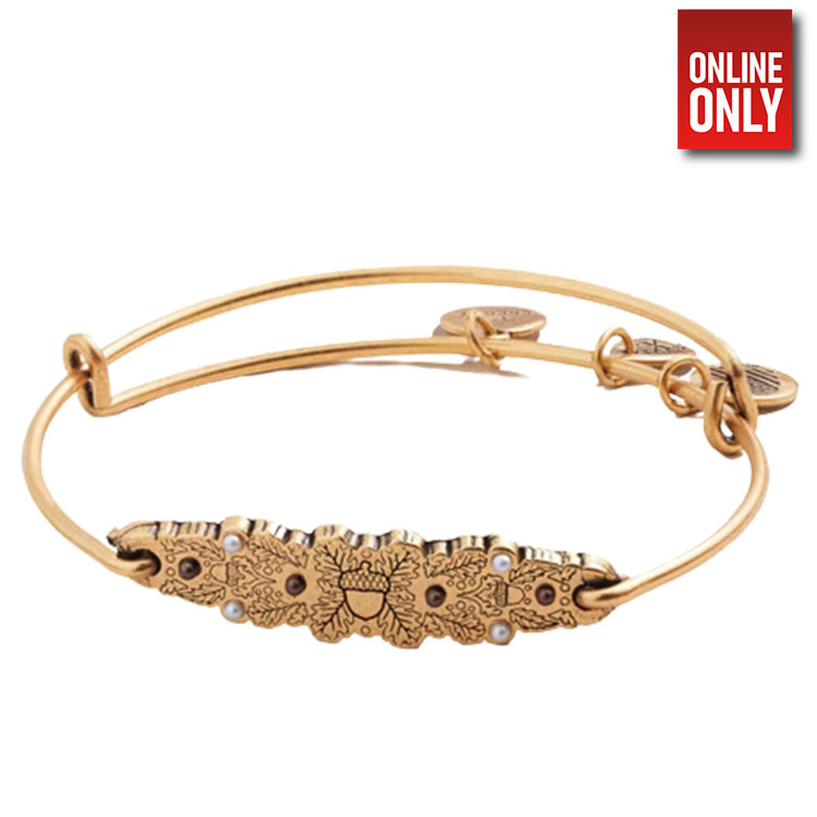 Wear this expandable wire bangle as a reminder to live life to the fullest. Features an inline charm with oak leaves and acorns, adorned with glass pearls.