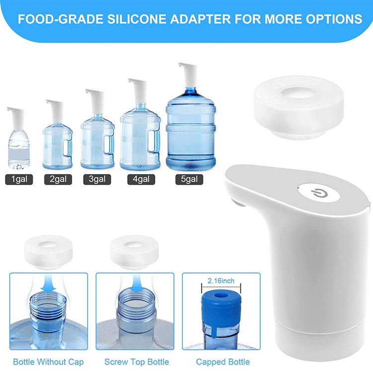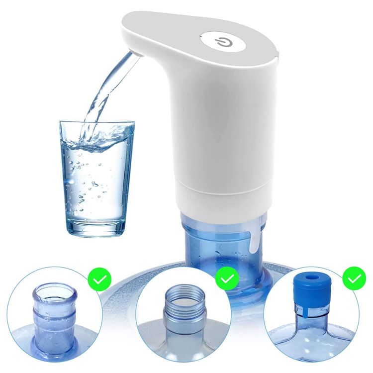 USB Powered: Rechargeable battery, can be used to pump 4-6 jugs of water if fully charged.