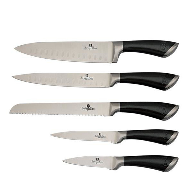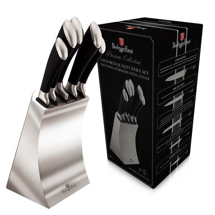Material: 3CR13 Shanghai stainless steel Chef knife 20 cm Bread knife 20 cm Slicer knife 20 cm Utility knife 12,5 cm Paring knife 9 cm Stainless steel stand Color: black stainless steel block laser cut blades dimples on the blade made by one piece ergonomic handle dishwasher safe fingerguard design.6-piece knife placed on a Berlinger Haus stainless steel stand from the passion series. Designed for slicing meat and fish, cutting bread, peeling and chopping vegetables. Knives made of high quality stainless steel. Laser focused.