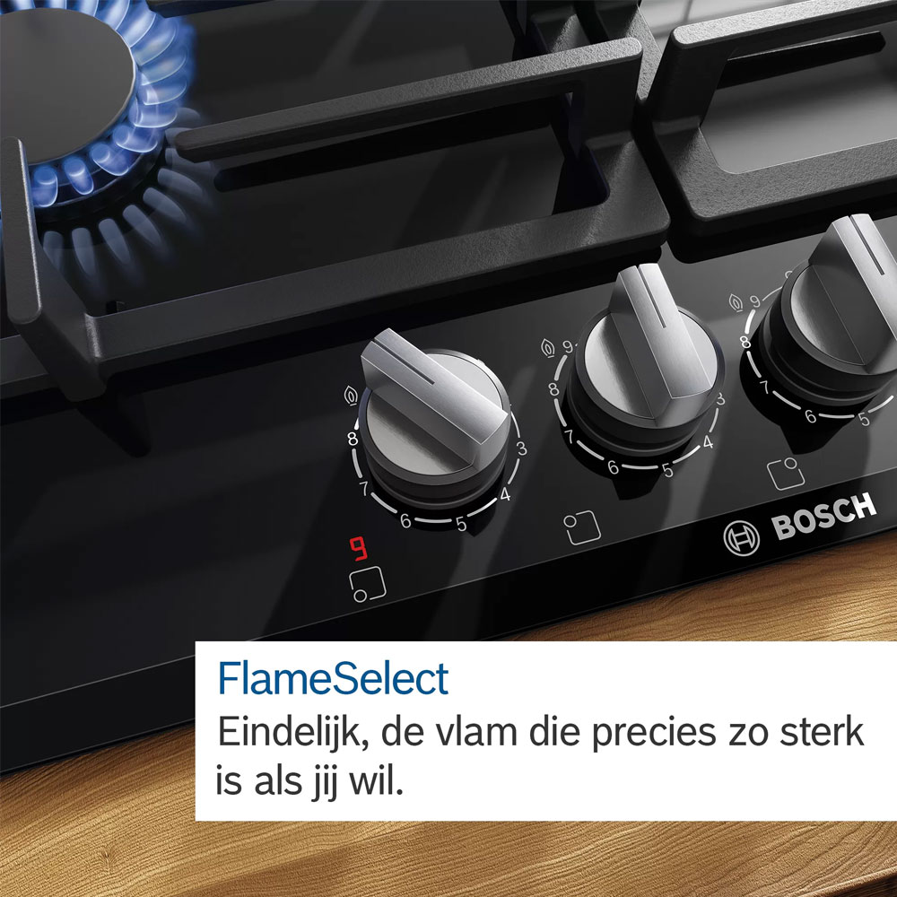 On a gas hob with FlameSelect you adjust the flame more accurately than ever. Thanks to perforated discs in which the holes increase in size, the gas flow is perfectly regulated. Nine flame sizes are at your disposal at least.