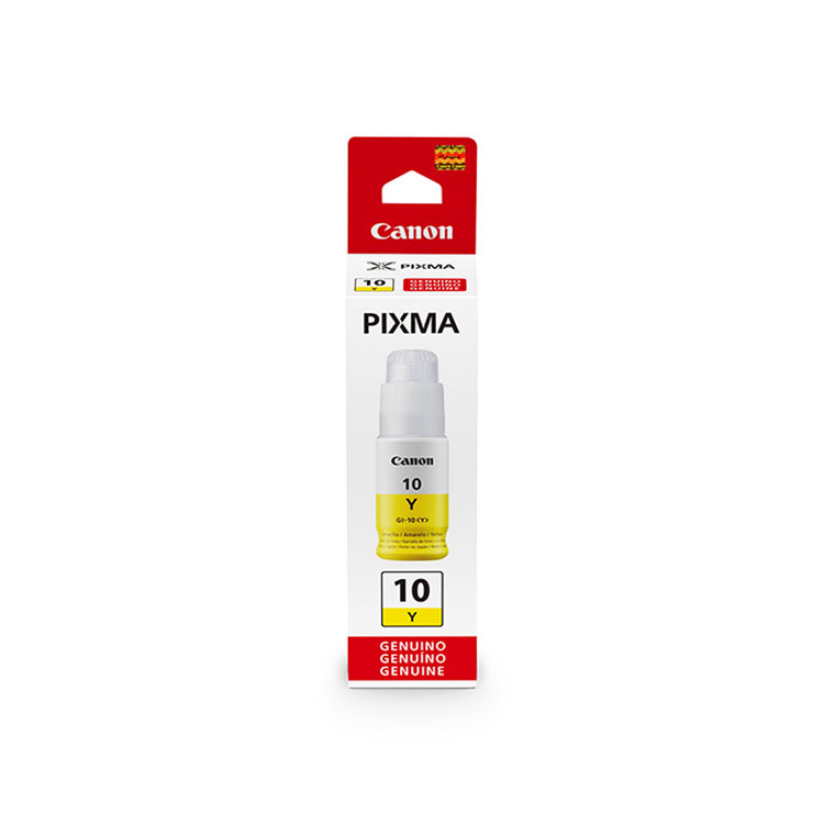 The GI-10Y Canon yellow ink bottle has a yield of up to 7,700 color pages. Designed for easy recharging of your compatible printers. The smart ink bottle design allows the user a more user-friendly experience that minimizes potential spills, leaks and smudges. Ink refilling starts as soon as the bottle spout is attached to the ink tank. Print yield is an estimated value based on Canon’s individual test method, using the iso/iec 24712 chart, which simulates continuous printing with the replacement bottle until ink runs out after initial setup.