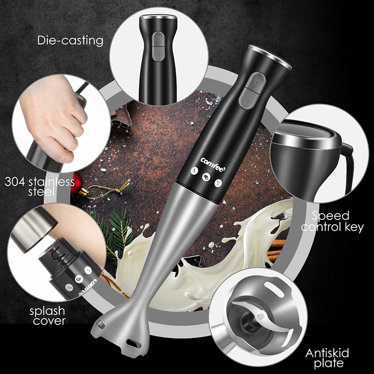 Meet Your DemandsPerfect for making smoothies and soups with blender stick, chopping onion,cabbage vegetables with the food processor, and whisk for whipping egg whites for cakes. |