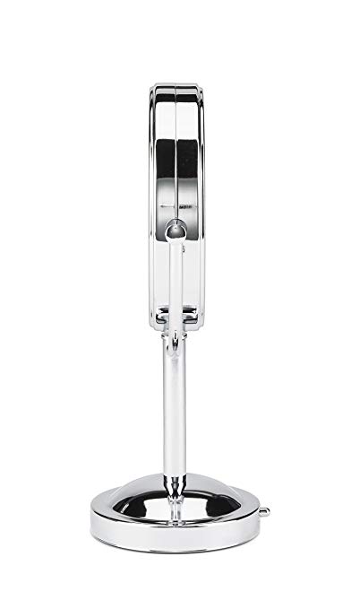 Nothing beats a professional lighted mirror to bring makeup application and other skin-care procedures to maximum polish. This double-sided pedestal mirror offers regular and 5x magnification. The halo lighting around the perimeter of the mirror provides soft, glare-free lighting for optimum clarity. Considered a midsize mirror, it stands 12 inches tall, while the mirror itself measures a little less than 4-1/2 inches in diameter. It operates with three AA batteries (not included) or with a plug-in adaptor whose cord measures 9 feet long. The brilliant chrome finish and handsome lines give this mirror a classic appeal that fits easily with any style of décor