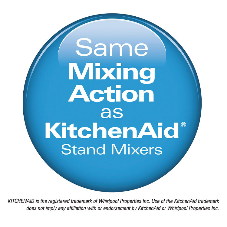 This stand mixer has the same mixing action as KitchenAid® stand mixers*. Tilt-up head for adding ingredients and changing attachments quickly.