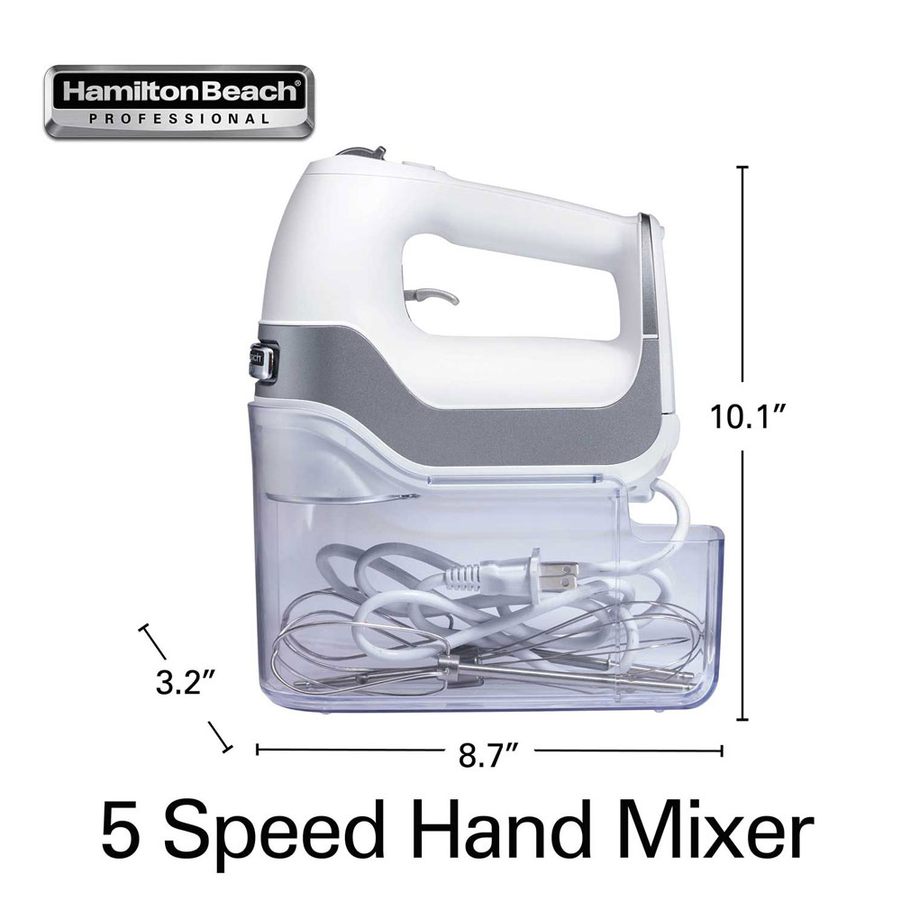 Whether it’s lighter-than-air whipped cream or chewy chocolate chip cookie dough, you can mix ingredients effortlessly with the Hamilton Beach Professional 5-Speed Hand Mixer. Lightweight and powerful, this mixer has a slow start that prevents splatters, no matter what you’re mixing. Push the QuickBurst button for an extra punch of power at any of the five levels. A lockable swivel cord, snap-on storage case and trigger-release makes mixing easy from start to finish.