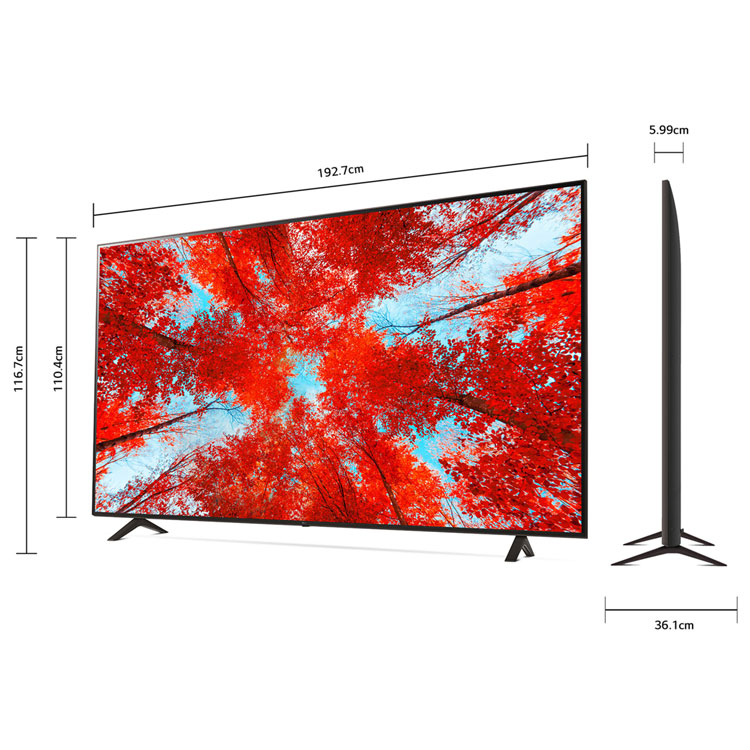 LG SMART TV 86″ UHD 86UQ9050PSC 4K Display; Experience realistic image quality and vivid colors with REAL 4K. Compatible with FILMMAKER MODE and Active HDR. You can bring the cinema experience home in REAL 4K image quality with an ultra-large screen. Its new α7 Gen5 AI 4K processor automatically analyzes and optimizes picture and sound, so content looks great.