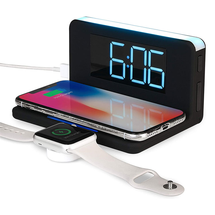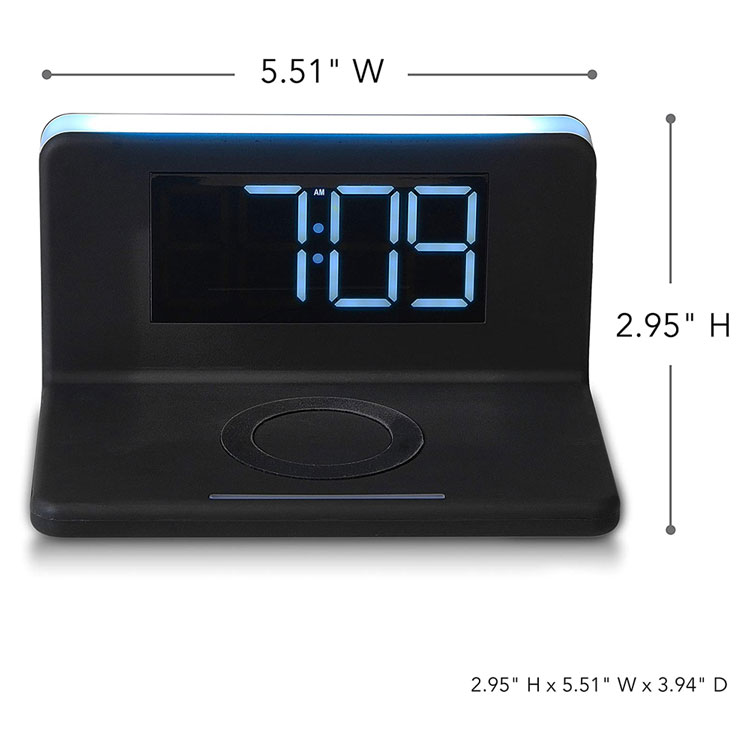 Wake ready for the day with fully-charged devices by using this convenient and easy-to-read RCA digital alarm clock featuring 10-watt wireless charging and a USB charging port. Simply set your smartphone on the clock base to fully-charge your devices while you sleep and/or plug in your smartphone, smart watch, or other device using the USB port conveniently located on the side of the clock. (Please note: Your device must have wireless charging capabilities in order to use the wireless charging function). The nightlight feature provides upward illumination and can be set to 3 brightness levels or turned off. The modern, low profile design make this a stylish, yet functional piece for the bedroom, kitchen or office. Powered with the 3’ included USB-C cable and AC adapter.