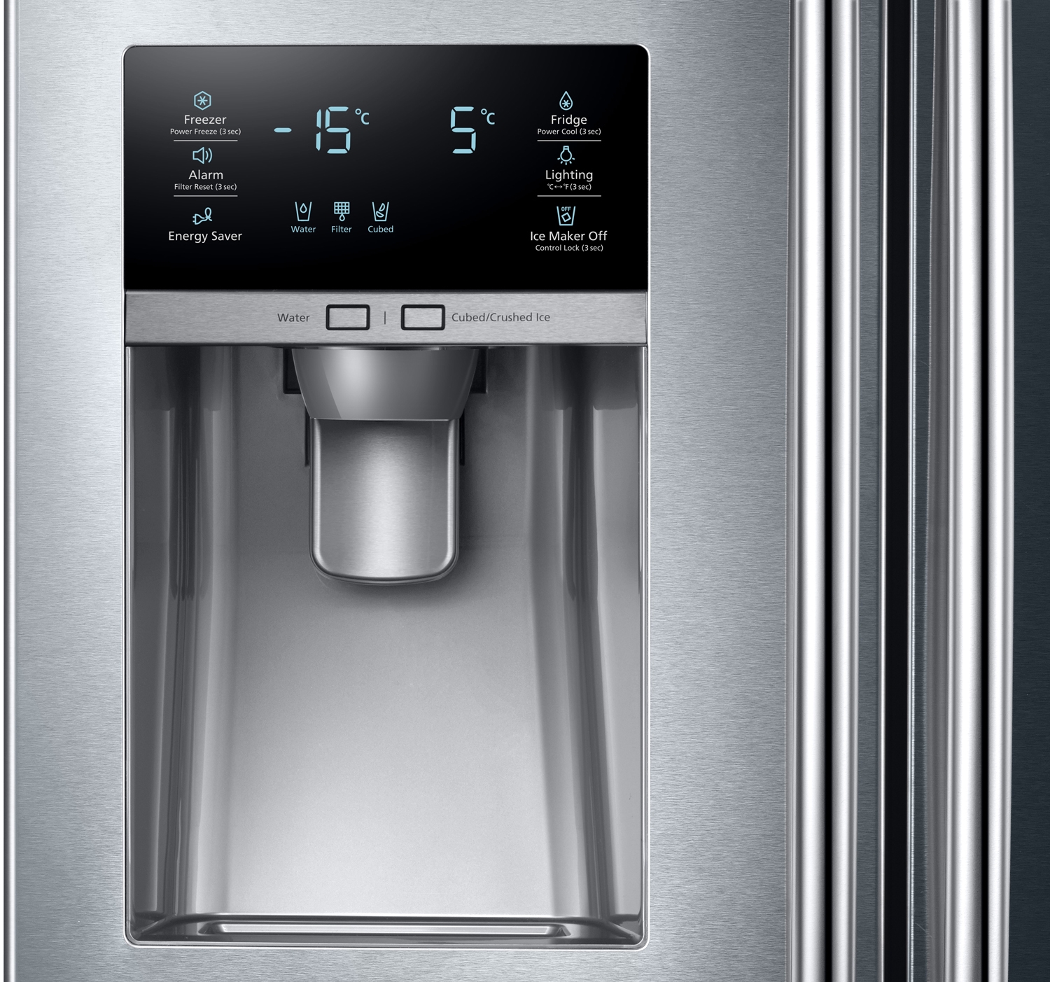Samsung RF7500J refrigerator has a 33” width narrow design, so it saves valuable space and is ideal for smaller kitchens. It looks sleek and elegant, but can easily accommodate all of your family’s favorite food even if you’re short of room.