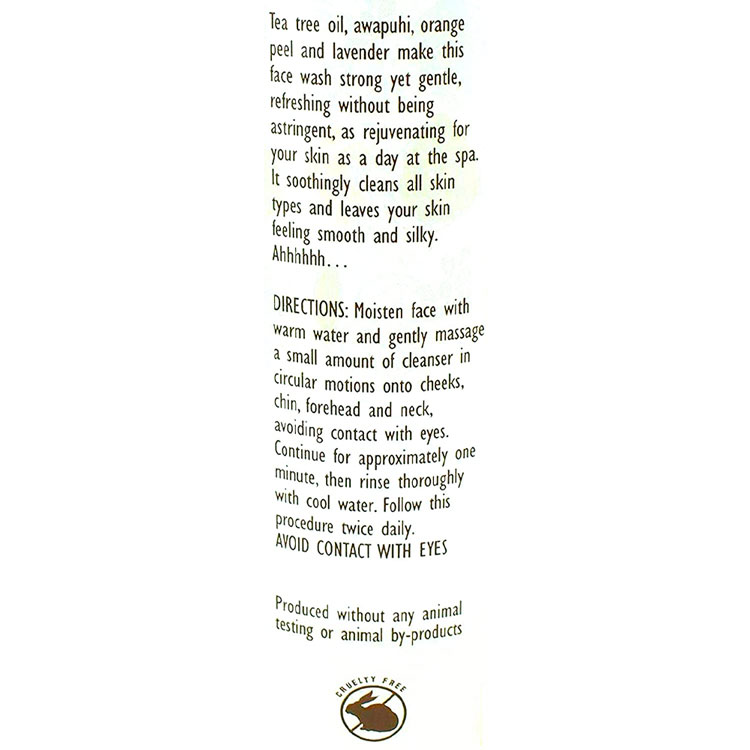 Tea tree oil, awapuhi, orange peel and lavender make this face wash strong yet gentle, refreshing without being astringent, as rejuvenating for your skin as a day at the spa. It soothingly cleans all skin types and leaves your skin feeling smooth and silky.