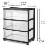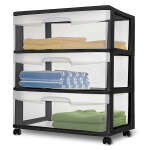 The 3-drawer cart Sterilite Wide offers a practical and versatile storage solution for any room in the house. Organize and store a variety of household items that are frequently used in the bedroom, kitchen / pantry, bathroom, craft room, nursery or bedroom. Transparent drawers allow you to easily identify the content while keeping them in place. Keep clothes, towels, craft supplies, toys and more organized and well stored. The drawer stop function prevents drawers from accidentally withdrawing. Use the included wheels to create a storage option with wheels, and easily move the drawer cart where necessary.