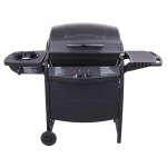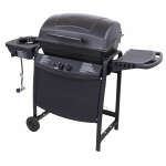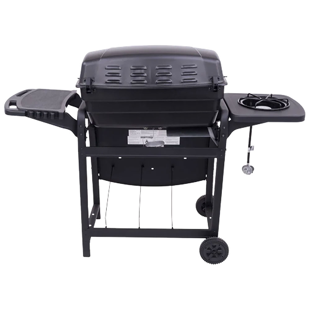 This grill features 35,000 BTUs of cooking power spread across 360 square inches of cooking surface. Stainless steel burners are rust-resistant and the porcelain-coated grates keep food from sticking and are easy to clean. Equipped with an 8,000 BTU side burner, plastic side shelves, built-in tool hooks for storage, a Piezo ignition system, and porcelain-coated steel lid and firebox designed to withstand the elements. This grill also features two 6 inch wheels and stationary legs for easy portability and stability.